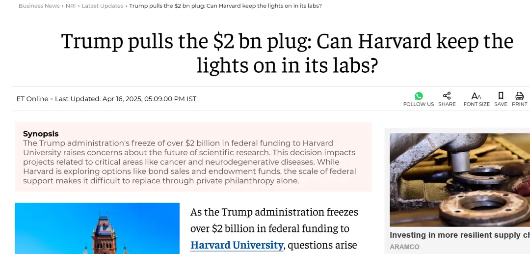 這幾天,哈佛大學對抗白宮的事件仍在發酵中。繼哈佛硬剛後,其不僅凍結了對哈佛22億美金的聯邦撥款。