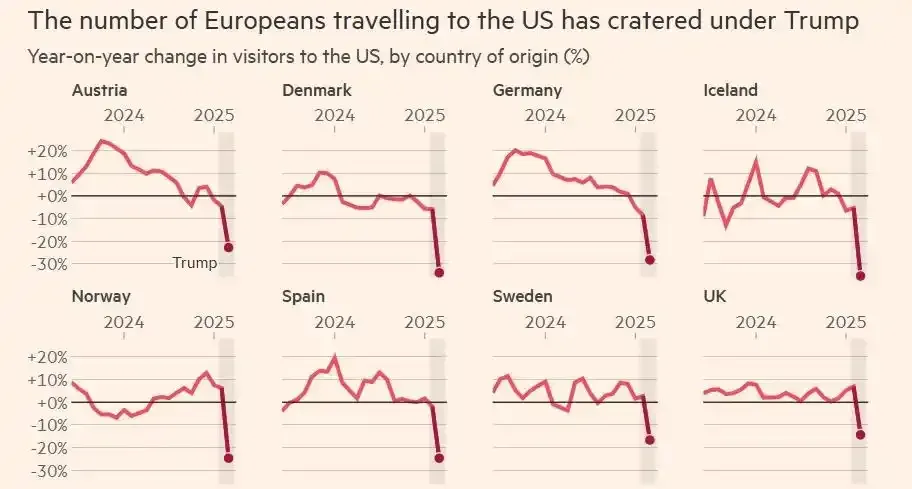 ▲據英國《金融時報》4月12日報道,由於特朗普政府收緊移民和入境政策,同時對歐洲國家施壓關税和安全威脅,美國旅遊業遭受嚴重衝擊,前往美國的歐洲遊客數量急劇下降。(《金融時報》製圖)