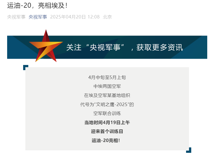 這個答案得到了中國空軍的確認。根據中方發佈的官方消息,當地時間19日上午,中埃“文明之鷹-2025”空軍聯合訓練在埃及空軍某基地迎來首個訓練日,中方派出殲擊機、預警機、加油機和直升機等力量參訓。為確保參演裝備與人員高效投送,中方採取“空轉+空運”混合編組模式,經過多個國家,航程近6000公里,於15日完成全員全裝進駐。此次聯訓是中埃兩軍首次組織聯訓。