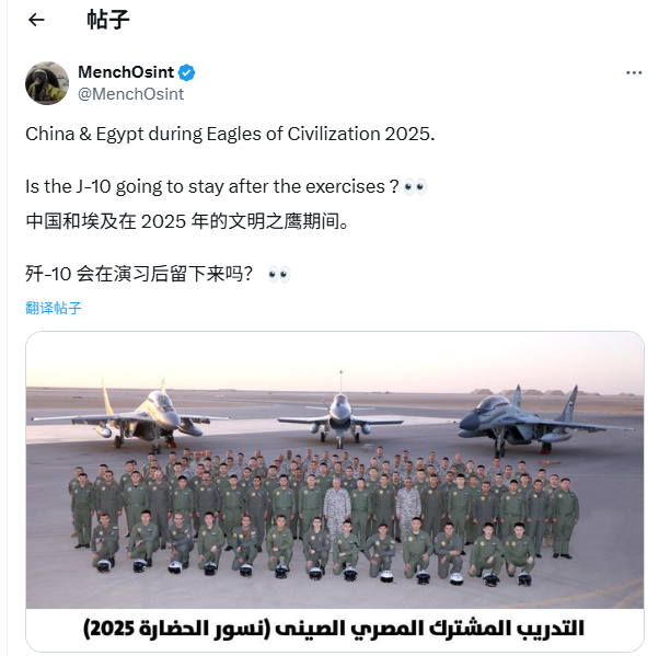 幾天前中國國防部宣佈,中國與埃及將舉行首次“文明之鷹-2025”聯合空中演習。中國空軍20日又透露,參加演習的機羣和裝備已經於15日全部抵達埃及,如今雙邊演習的第一個訓練日已經開始。筆者注意到,這次解放軍參加演習的機羣配置非常有意思——除了運油-20、空警-500、殲-10C之外,還有出現了雙座版的殲-10S。