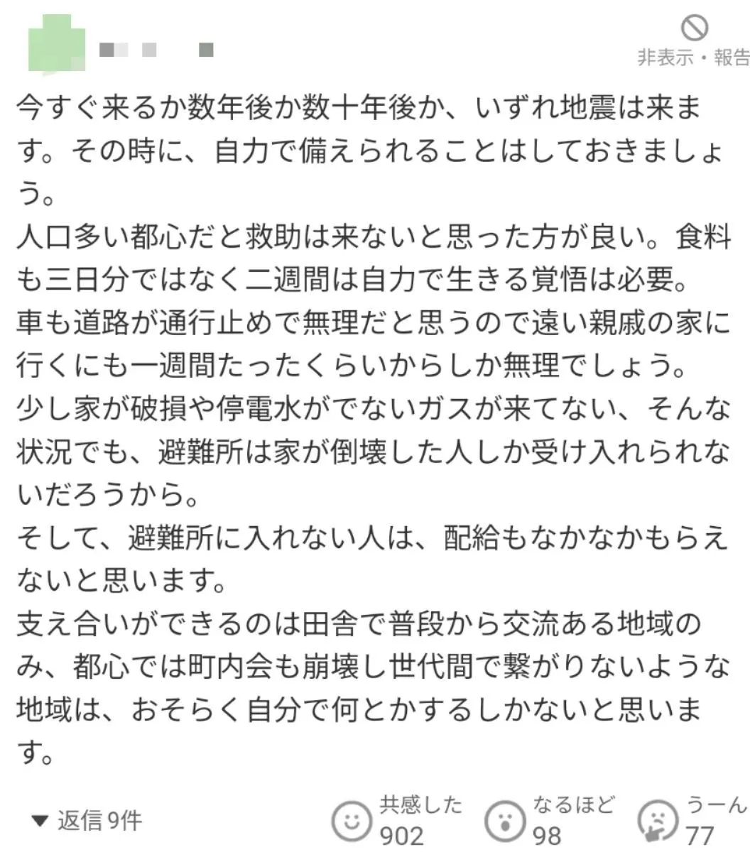 是現在來,還是幾年後,還是幾十年後,地震總會來的,儘量自己準備吧。在人口眾多的市中心,最好是做好不被救援的準備,食物也不能只儲備三天的量,需要準備兩週靠自己的力量生存下去的覺悟。那時,由於道路堵塞,所以去遠的親戚家也只能從一週後才開始。在這種情況下,避難所也只能接受房屋倒塌的人。不能進入避難所的人,也很難拿到物資。能互相支持的只有在鄉下平時就有交流的地區,在市中心町內會也崩潰了,世代間不和諧的地區,恐怕只能自己想辦法了。