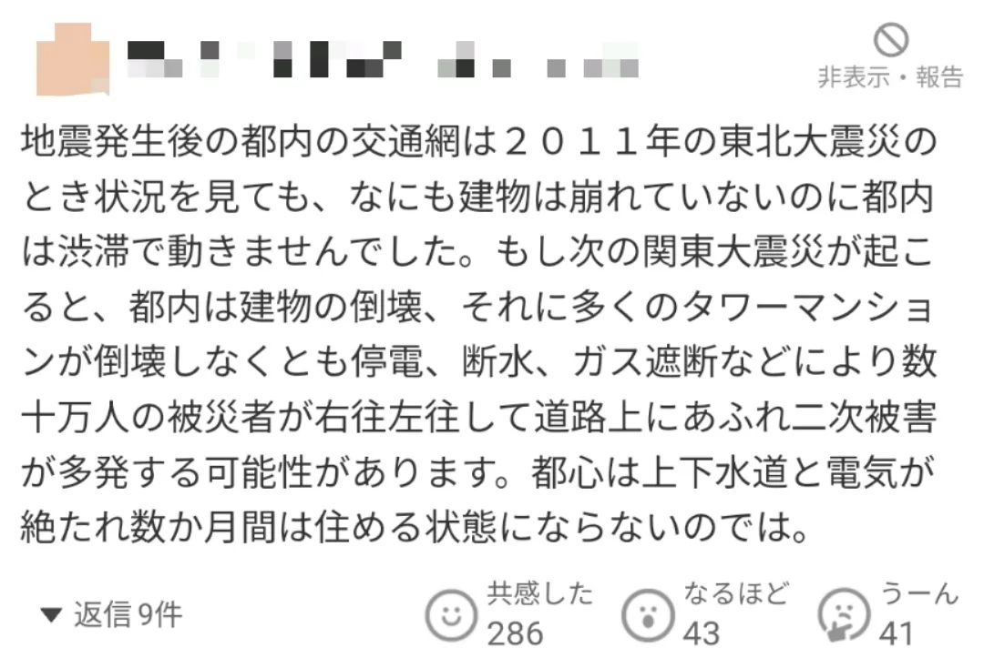 看了一下2011年東北大地震的地震發生後的交通網,雖然建築物沒有倒塌,但東京都內卻因交通堵塞而無法移動。如果下一次關東大地震發生的話,東京都內建築物發生倒塌,即使很多堅固的公寓沒有倒塌,由於停電、停水、煤氣切斷等原因,數十萬受災者東奔西走,道路上也有可能發生二次災害。市中心上下水道和電被切斷,幾個月不能成為可以居住的狀態。