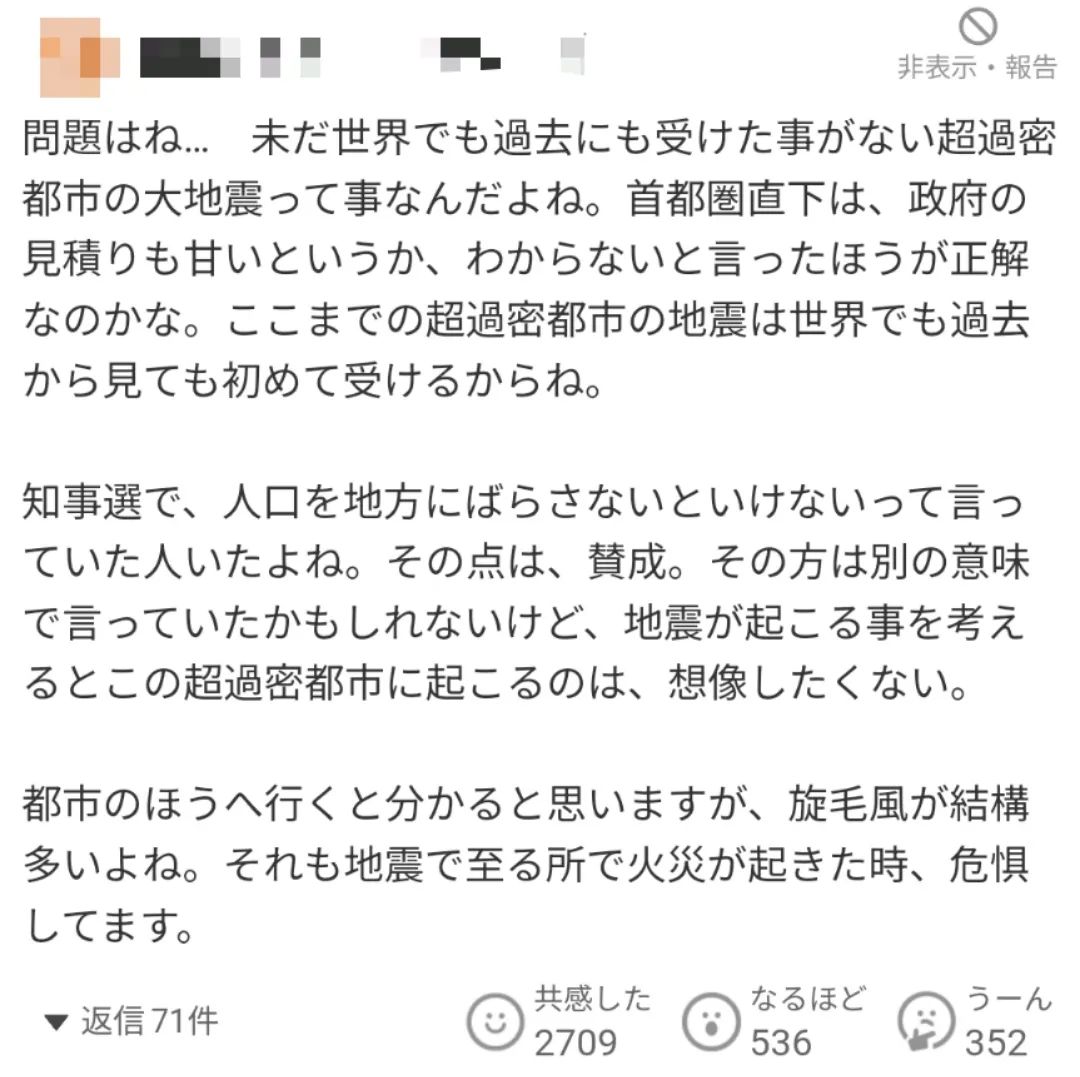問題是…在世界上和過去都沒有經歷過的超過密城市的大地震。在首都圈正下方,政府的預估也太天真了,還是説不知道才是正確的。到現在為止的超密集城市的地震無論從世界還是從過去來看都是第一次。在知事選舉中,有人説過要把人口分散到地方去。這一點我贊成。那個人可能是從別的意義上説的,但是一想到發生地震,就不想想象在這個超過密的城市發生。如果在城市的話會發現小型龍捲風挺多的,在地震中到處都發生了火災時,我也很擔心。