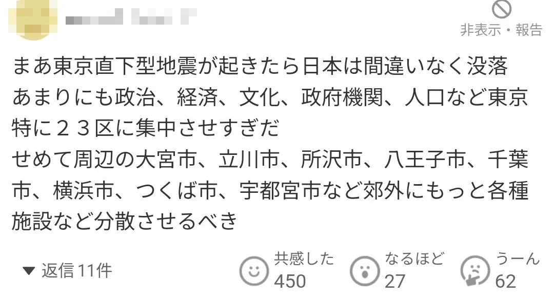 如果發生東京直下型地震,日本肯定會衰落,政治、經濟、文化、政府機關、人口等都過於集中,尤其是東京23區。至少應該在周邊的大宮市、立川市、所澤市、八王子市、千葉市、橫濱市、筑波市、宇都宮市等郊外分散更多各種設施等。