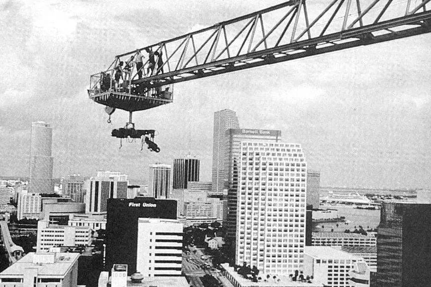 △ 攝製組被懸掛在一個臨時的“攝像平台”上,該平台連接着邁阿密市中心上空的起重機臂。