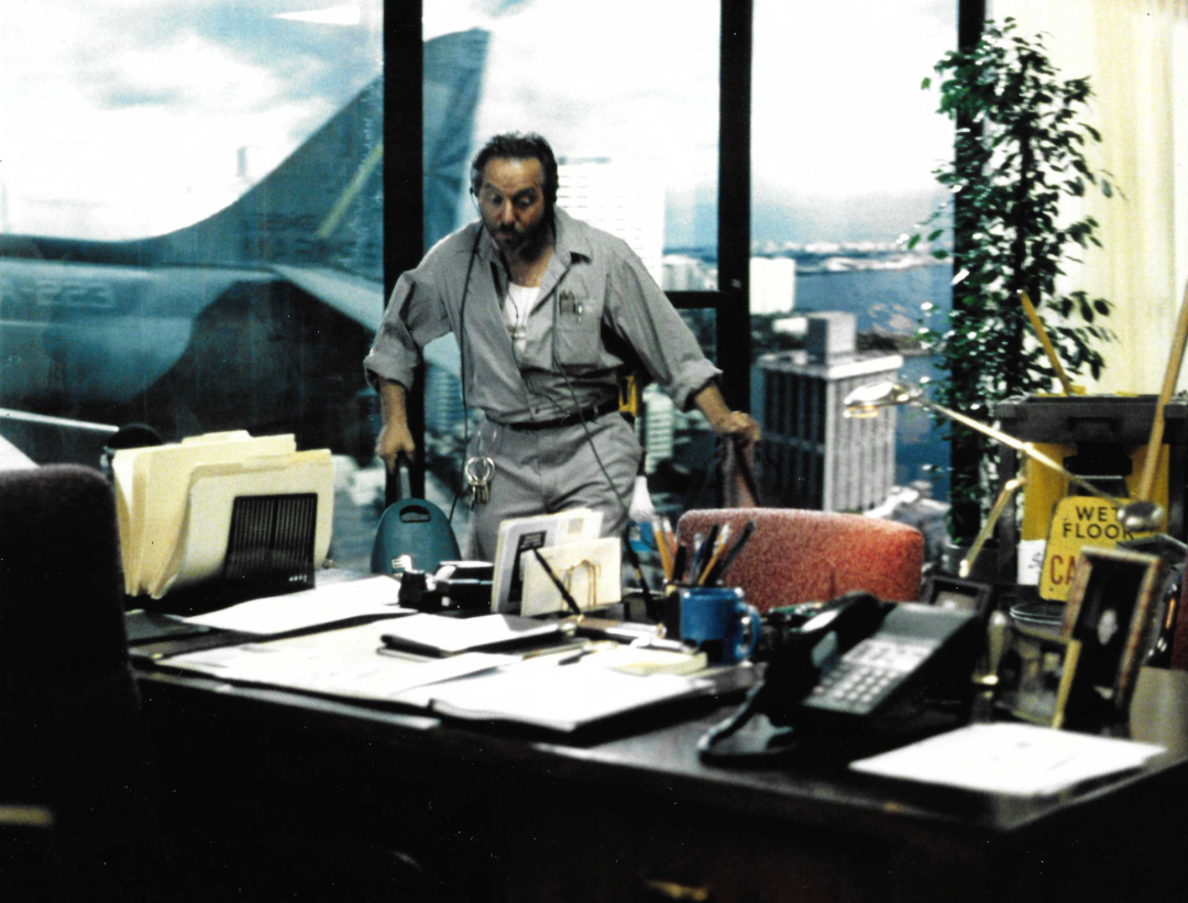 當哈里爾戰機即將撞入大樓時,樓內一位戴着耳機、悠然自得的清潔工正在專注地擦地,對身後窗外發生的事情渾然不覺。
