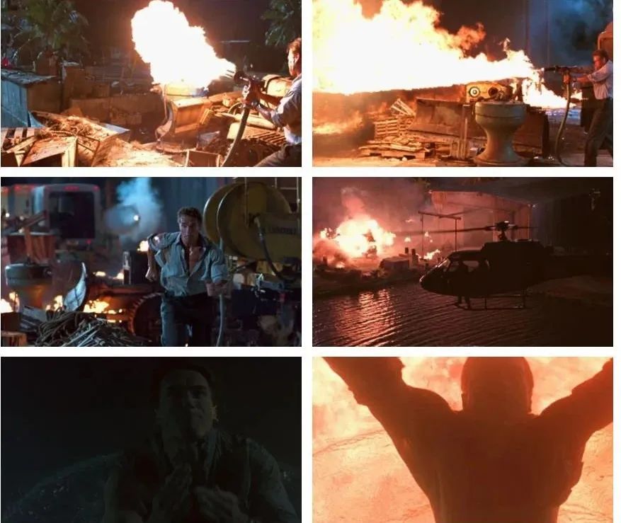 △ 哈利(施瓦辛格飾)從火焰噴射器前躍起,險些逃脱,然後必須在燃燒的海浪下游到安全地帶。