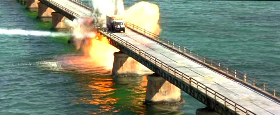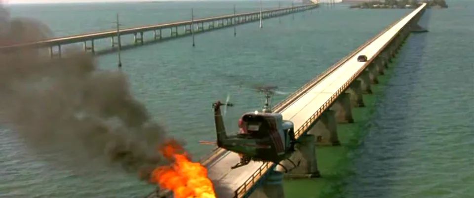 如果説有哪場戲最能體現《真實的謊言》在實體特效上的成就,那無疑是佛羅里達羣島的橋樑爆破戲。