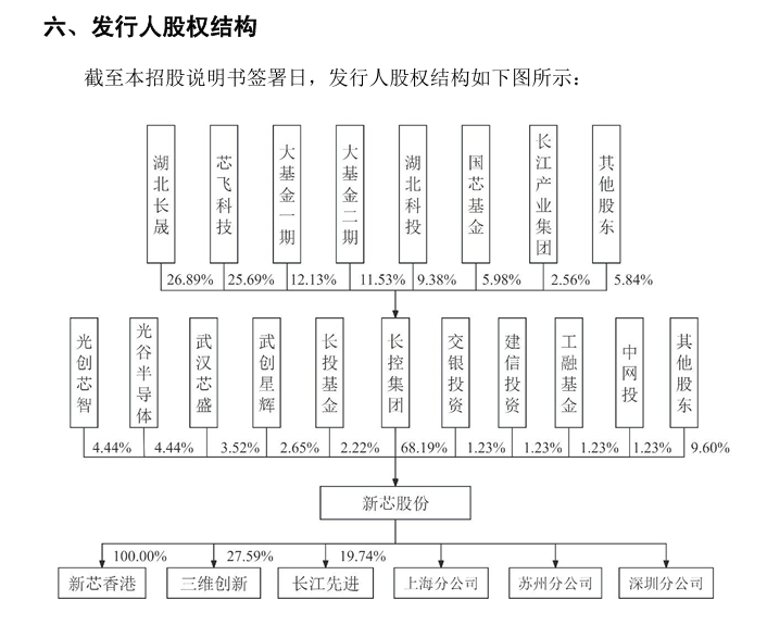 目前,新芯股份的控股股東為長江存儲科技控股(長控集團)持股68.19%,穿透後大基金一期、二期分別持股12.13%和11.53%,形成“無實控人”架構。