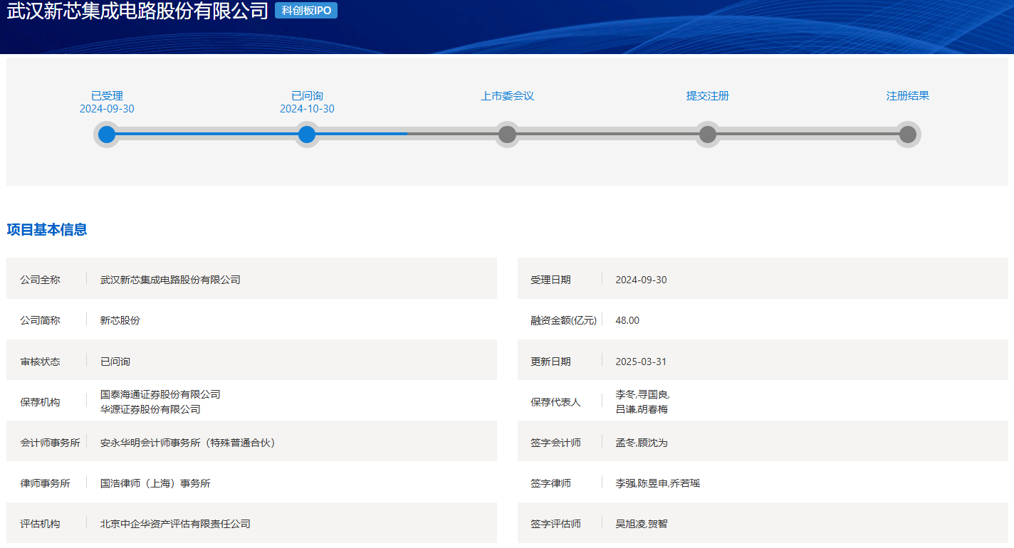 3月31日,上交所官網顯示,武漢新芯集成電路股份有限公司(簡稱“新芯股份”)的科創板IPO審核動態變更為已問詢,並且重新更新了招股書。