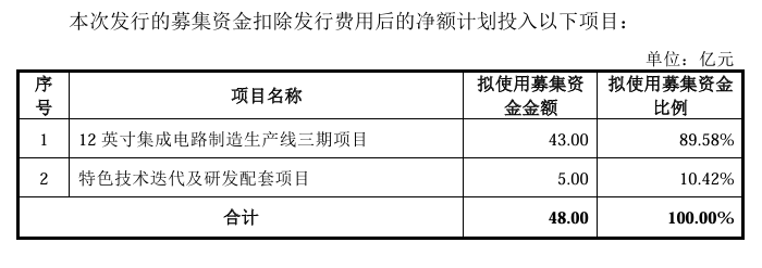 在最新更新的招股書上,新芯股份披露擬募資48億元,其中43億元用於12英寸集成電路製造生產線三期項目,5億元投入特色技術迭代及研發配套項目。