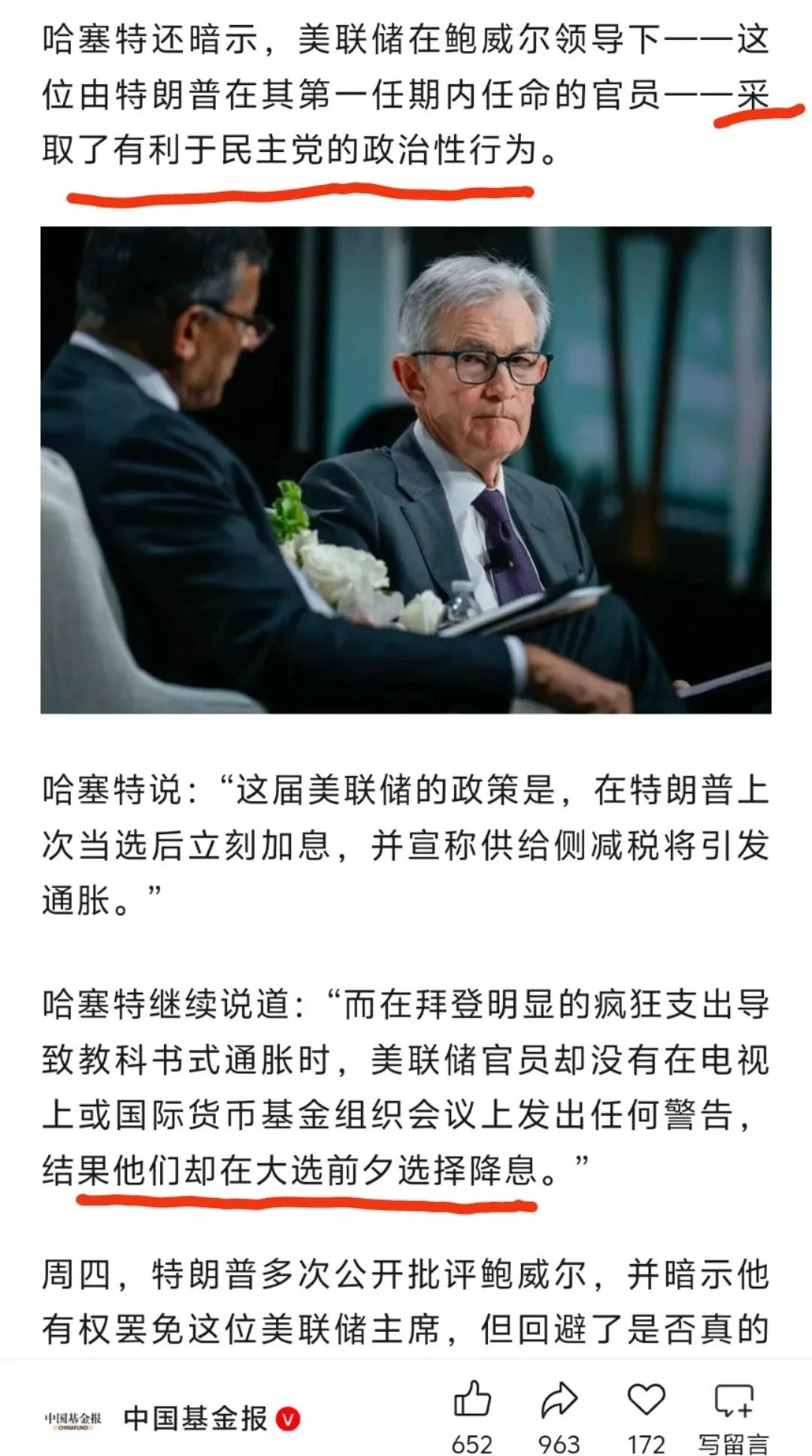 至於民主黨執政,還是共和黨執政,其實和你美聯儲是沒有任何關係的,你只要盯住物價指數和就業數據就行了。但是,鮑威爾卻參與到黨爭裏面了。
