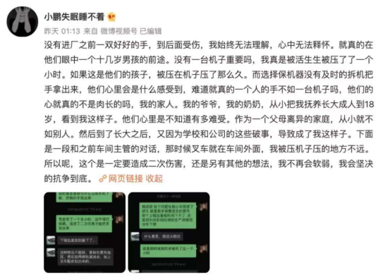 2021年1月份,郴州臨武職業中等專業學校三年級學生小鵬被學校強制要求到該縣久森新能源工廠實習,薪資1300元,每天要幹11個小時,小鵬的手掌被機器絞入,企業第一時間不是選擇拆機器,而是為了利益用潤滑油倒轉機器,導致小鵬食指中指齊根被截掉致殘。