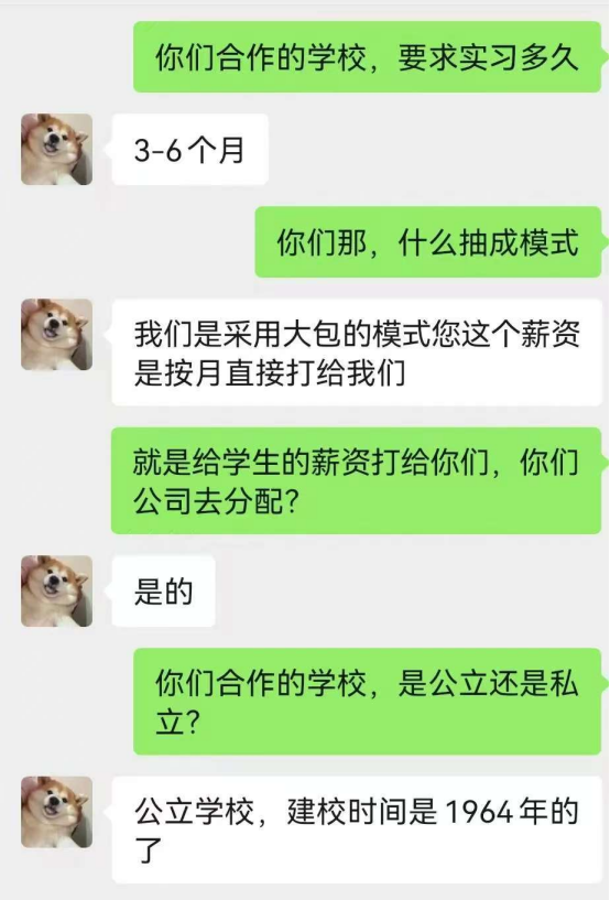 另一種是“打包人頭費”。直白來説,就是企業以每個學生300元-500元的提成,一次性給中介,中介再去和學校分配,而由於企業先付了這筆人頭費,後期給到學生的時薪自然會降低,但這些地下運轉的“潛規則”,學生們並不知情。