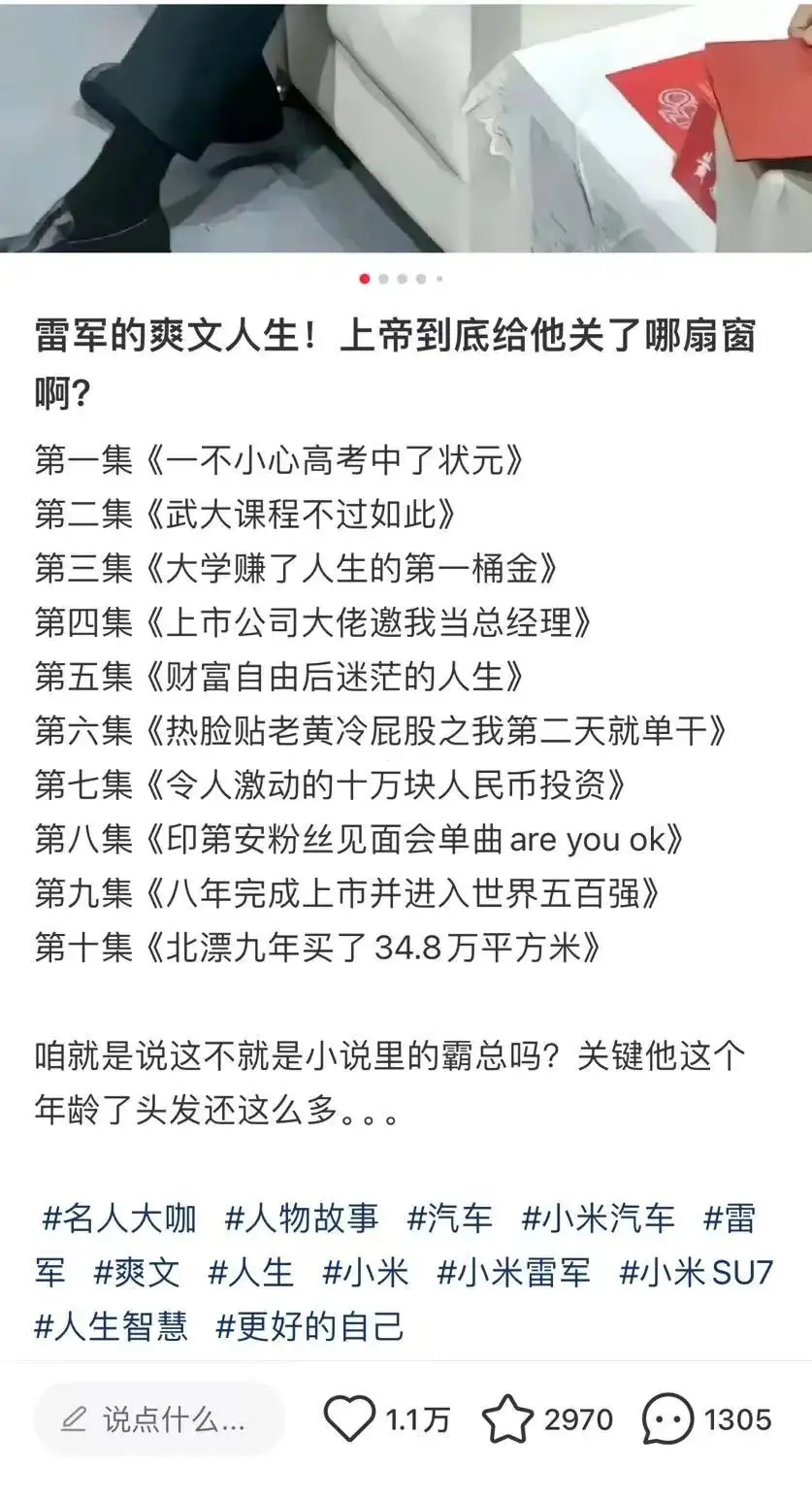 2019年7月3日,雷軍在抖音賬號發佈了第一條視頻, 2023年年底,為宣傳即將推出的小米汽車,雷軍營業頻率提升,截至目前,其抖音粉絲數量已破4500萬,獲贊破2億。當前其小紅書B站粉絲等也數量可觀,並且進行了一定的差異化運營,錨定小米核心目標用户——年輕人,每一條視頻和筆記,每一次直播都有大量的評論互動玩梗,他掛在嘴邊的“我給大家彙報一下”,也被解讀為“千億富豪主動營業討好我”。