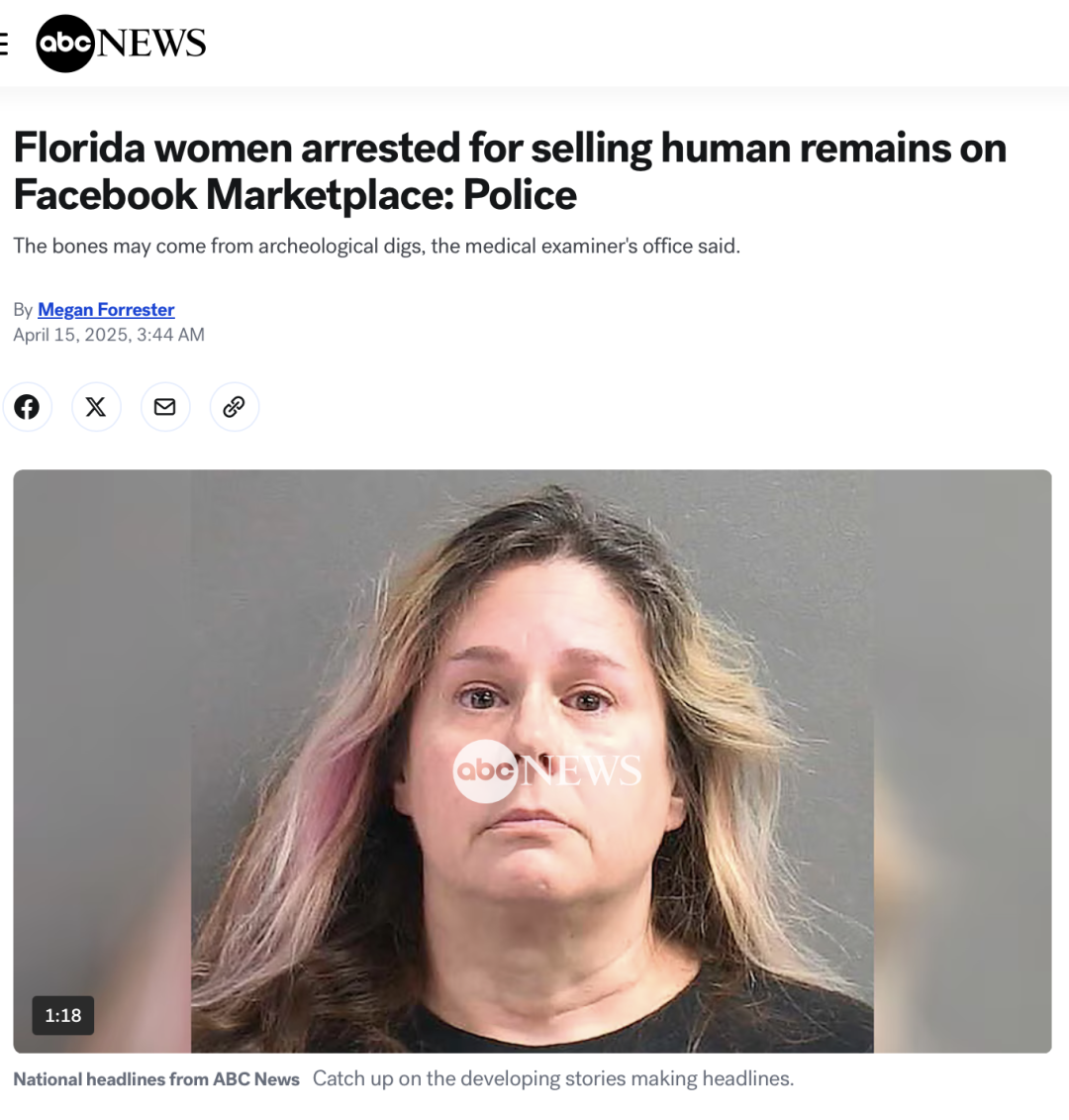 就在 4 月 13 日,據《紐約郵報》報道,一位 52 歲的佛羅里達州婦女在 Facebook Marketplace 上買賣人骨,兩個人頭骨 90 美元,一個人鎖骨和肩胛骨 90 美元,一根人肋骨 35 美元,椎骨 35 美元。