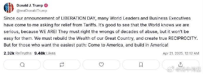 他表示被全球超多的政府元首和企業高管跪舔,要求減免關税。