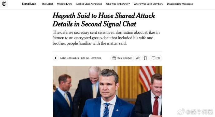 赫格塞斯向一個加密的 Signal 羣聊發送了有關也門襲擊事件的敏感信息,該羣聊中包括他的妻子和兄弟。