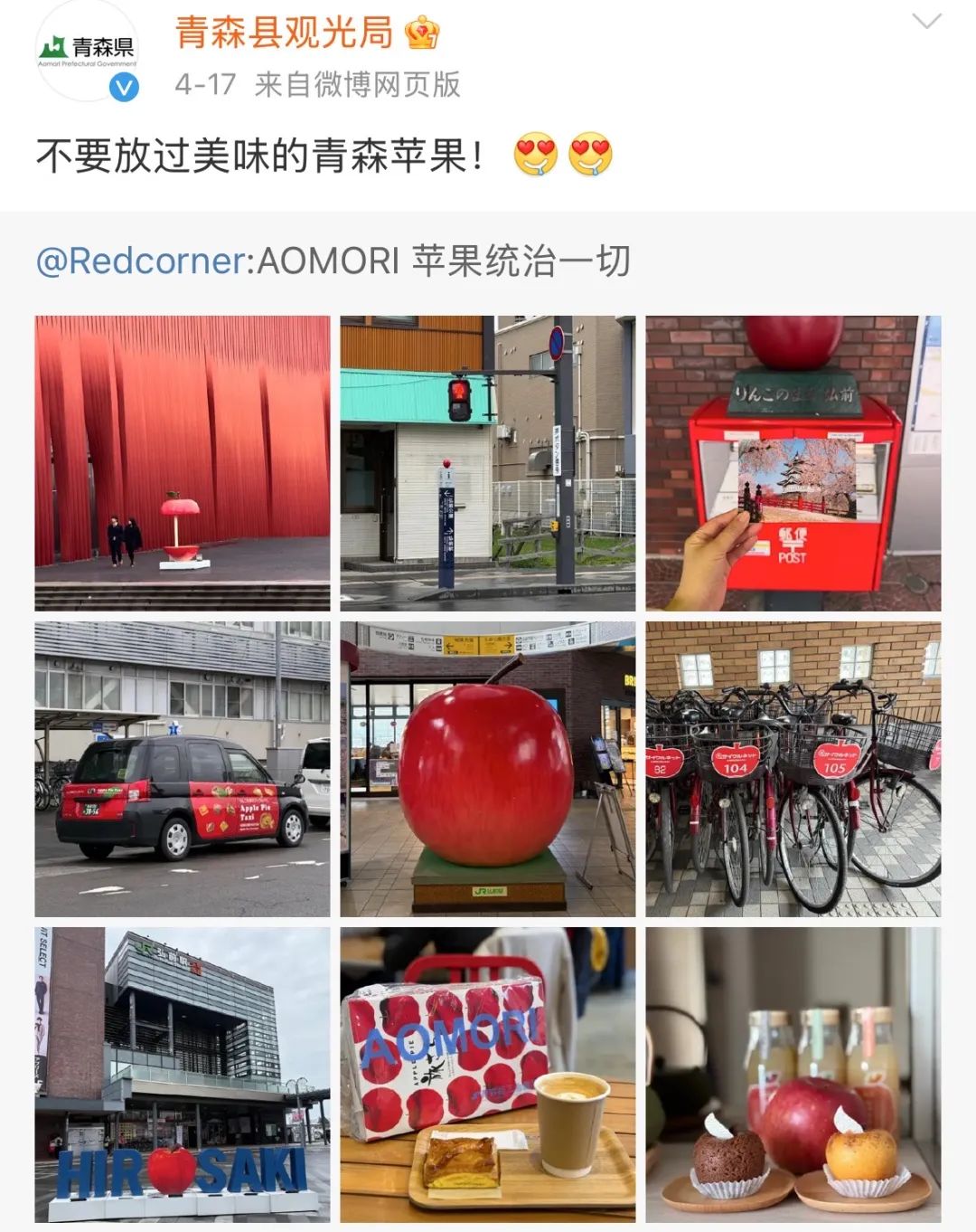 青森縣只有120萬人口,微博粉絲卻已經達到400萬,每年瀏覽量超過4000萬人次。青森縣此前就已通過微博旅遊推廣帶動當地旅遊,在微博文化交流之夜落地後,其官方微博更是大方營業,給中國網友安利自然風光、當地美食、祭典活動,廣邀粉絲前來做客。