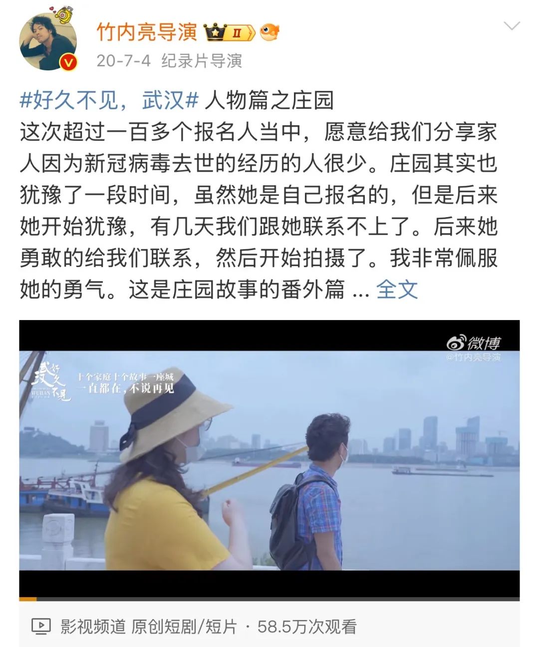 以竹內亮為例,在來到微博文化交流之夜前,他已積累下520多萬微博粉絲。早在疫情期間,他為創作紀錄片《好久不見,武漢》還通過微博尋找拍攝對象,最終正片上線24小時播放量就突破千萬。連中國外交部發言人都表示:“希望能夠看到更多這種接地氣、暖人心的紀錄片,更好地增進兩國民眾的相互理解。”