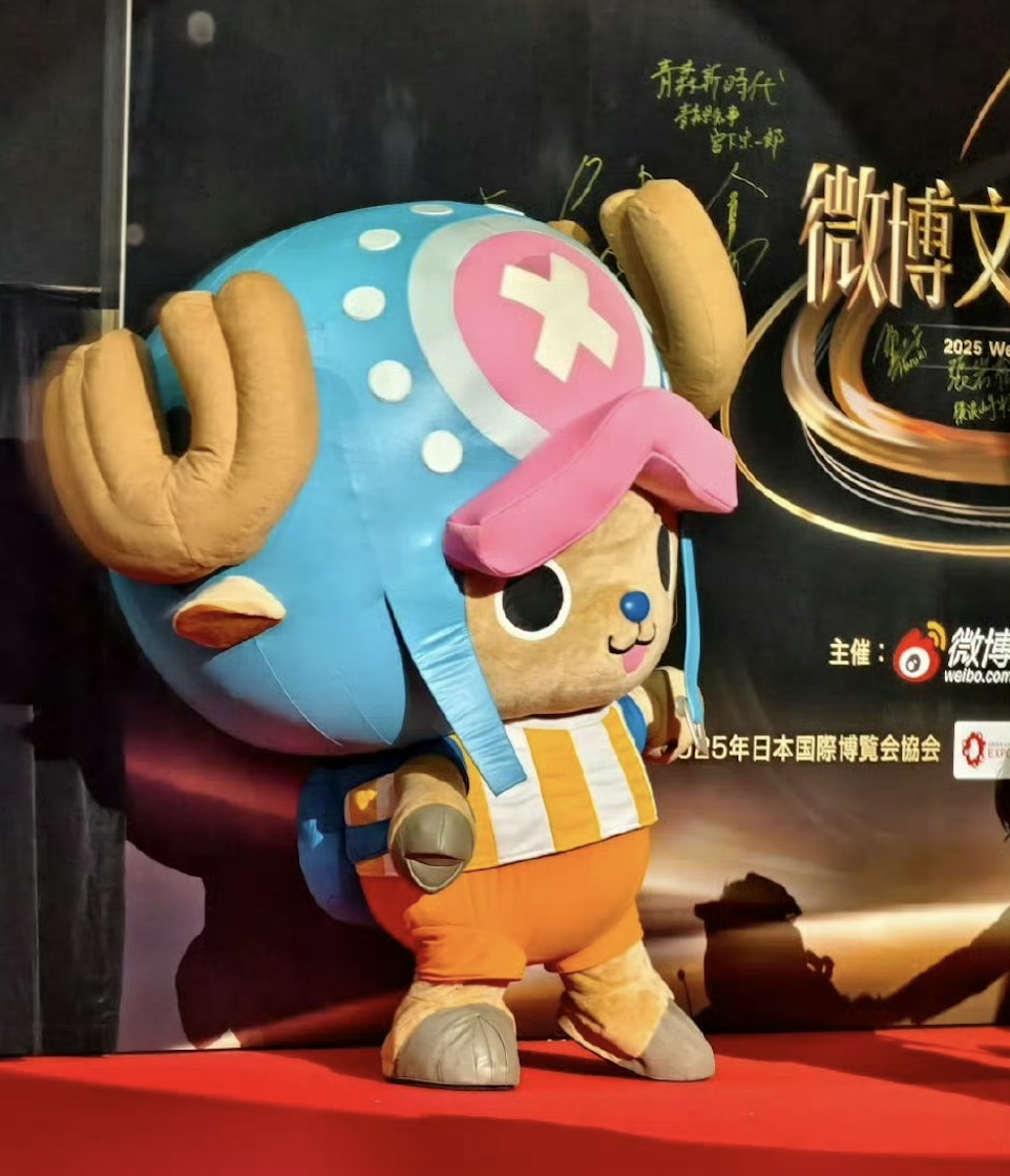 搞跨國“團建”的其實是微博。4月15日在日本橫濱舉辦的“2025微博文化交流之夜”上,不只有我們熟悉的文娛創作者,更有日本科技、藝術、體育等領域的代表人物,如作家今村翔吾、羽毛球名將志田千陽等。不過最讓硬糖君這個老二次元興奮的,還是《航海王》團寵“喬巴”踩着小碎步登場。