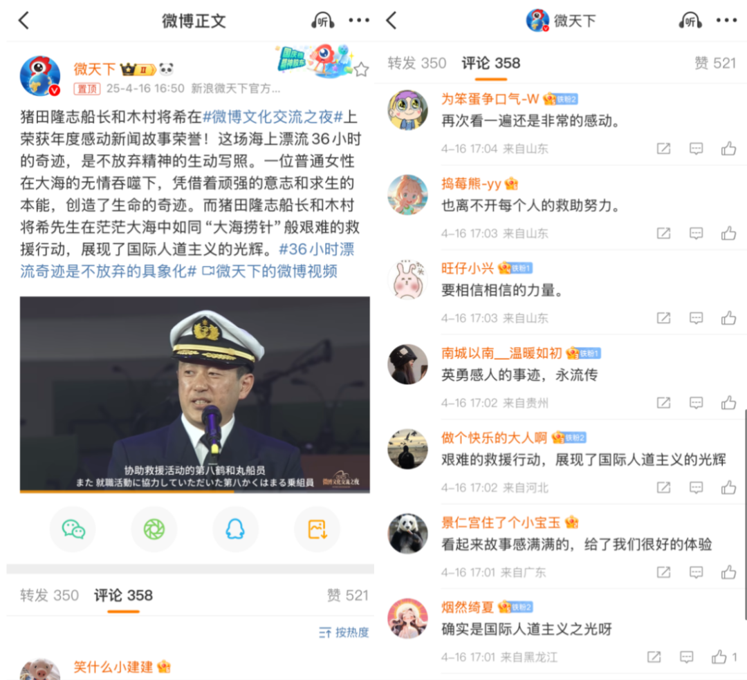 這一真實事件就引發中日網友對人道主義精神的討論,也帶動大家對安全意識、社會救援、旅遊安全等話題的關注。這足以説明,包裹人性温度和光芒的普世價值能夠打破國界,引發所有人的情緒共鳴。