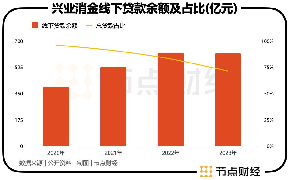 反映在數據上,截至2023年末,興業消金來自線下的貸款餘額為616.34億元,較2022年末的621.12億元減少4.78億元;在總貸款餘額中的佔比為71.33%,較上年末的82.90%下降了11.57個百分點。