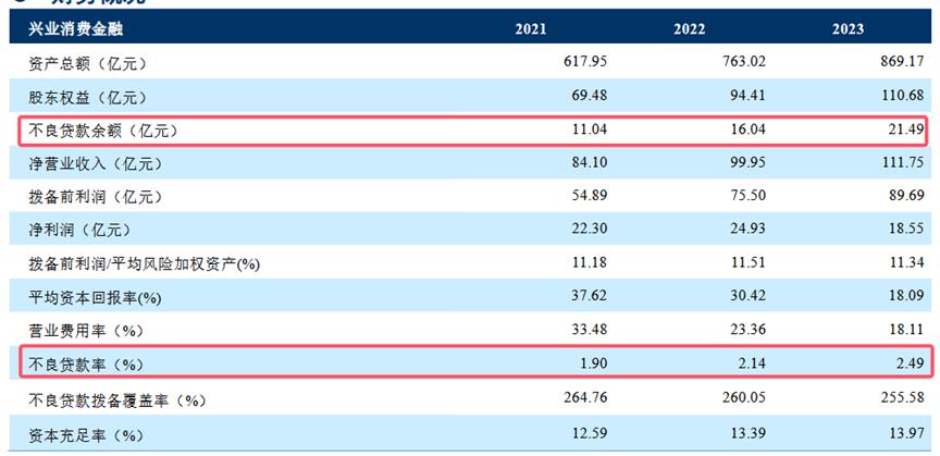 根據興業消金公佈的金融債發行公告,2021年-2023年,其不良貸款餘額分別為11.04億元、16.04億元、21.49億元,不良貸款率分別為1.9%、2.14%和2.49%,均呈逐年上揚趨勢。