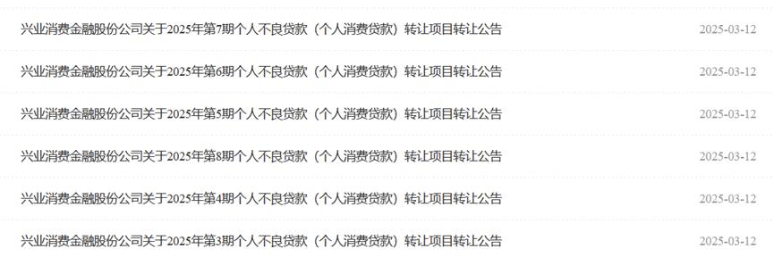 比如,今年3月12日,興業消金在銀登網上發佈2025年第3期至第8期不良資產(個人消費貸款)轉讓項目。其中,未償本息總額最大的是第8期不良資產包,達10.77億元,但項目起始價僅為1872萬元,相當於打0.17折。