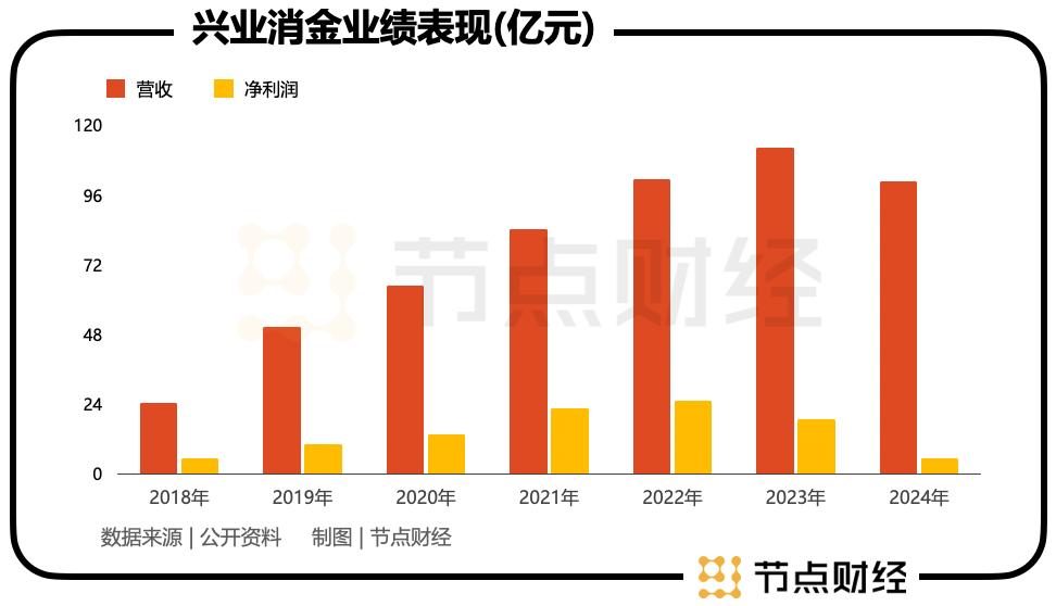 財報顯示,2024年,興業消金實現營收100.67億元,同比下降9.91%;實現淨利潤5.12億元,同比“腳踝斬”79.25%。