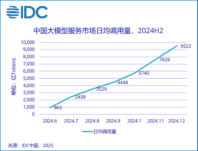 據IDC數據,6月到12月,中國公有云大模型調用量增長到了日均9522億Tokens,半年增長近10倍。