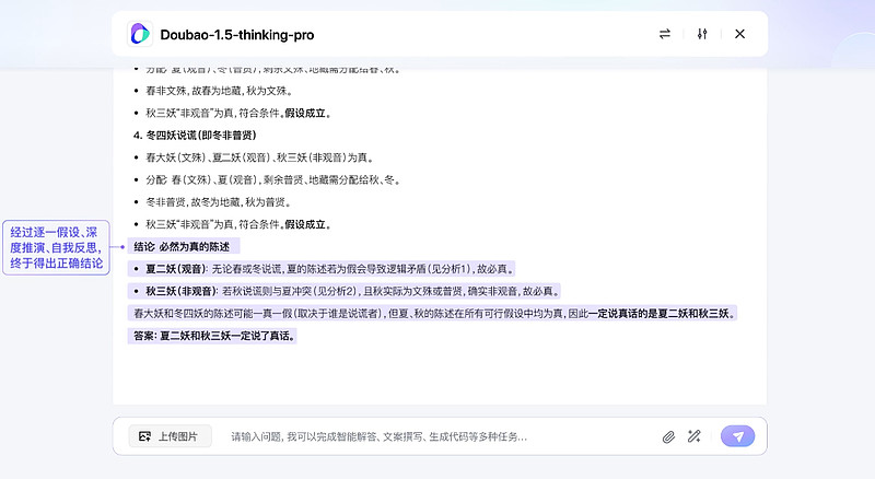 豆包1.5·深度思考模型先深度思考了故事,理解和提煉其中關鍵信息,並對四個妖怪的情況逐一假設推理,囊括不同條件和可能性,通過自我反思、迭代,迅速推出正確答案。