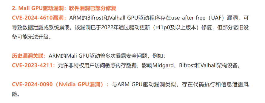 Mali GPU驅動漏洞:其中有CVE-2024-4610漏洞,該漏洞已於2022年通過驅動更新(r41p0及以上版本)修復,但部分老舊設備可能無法升級,可導致數據泄露,或系統崩潰。以及存在歷史漏洞關聯,如CVE-2023-4211和CVE-2024-0090(Nvidia GPU漏洞),與ARM GPU驅動漏洞類似,存在代碼執行和信息泄露風險。