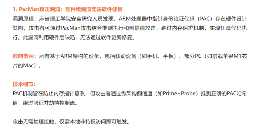 PacMan攻擊漏洞:攻擊者可通過PacMan攻擊結合推測執行和側信道攻擊,繞過內存保護機制,實現任意代碼執行。此漏洞利用硬件層缺陷,無法通過軟件更新修復;