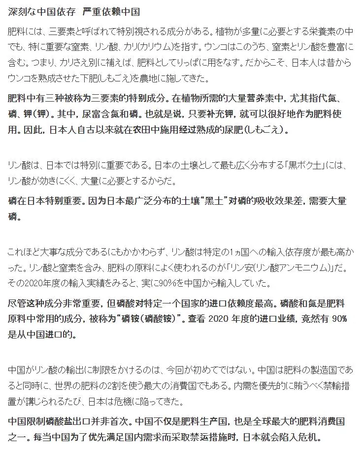 雖然日本的農業生產極度依賴磷酸,但在進口上卻高度依賴單一國家。截止2020年,日本超過90%的磷酸銨都是從某東方大國進口的。