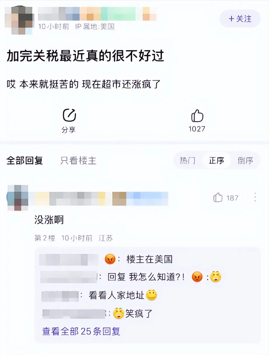為什麼這段話會看得我差點憋不住笑呢?因為它讓我想起了最近在網上刷到的一張貼吧截圖:一位IP定位在美國的網友感慨説:“加完關税最近真的很不好過。哎,本來就挺苦的,現在超市還漲瘋了。”完了留言區裏有個IP定位在江蘇的國內網友就回復他:“還有這事?沒聽説啊,沒感覺超市物價漲了啊。”