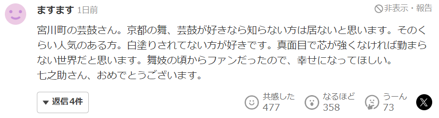 “是宮川町的藝伎啊。如果你喜歡京都的舞蹈和鼓,我想沒有人不知道。那麼受歡迎的人。我更喜歡沒有塗成白色的。我認為這是一個不認真、不堅強就無法勝任的世界。我從舞伎的時候開始就是她的粉絲了,希望她能幸福。
