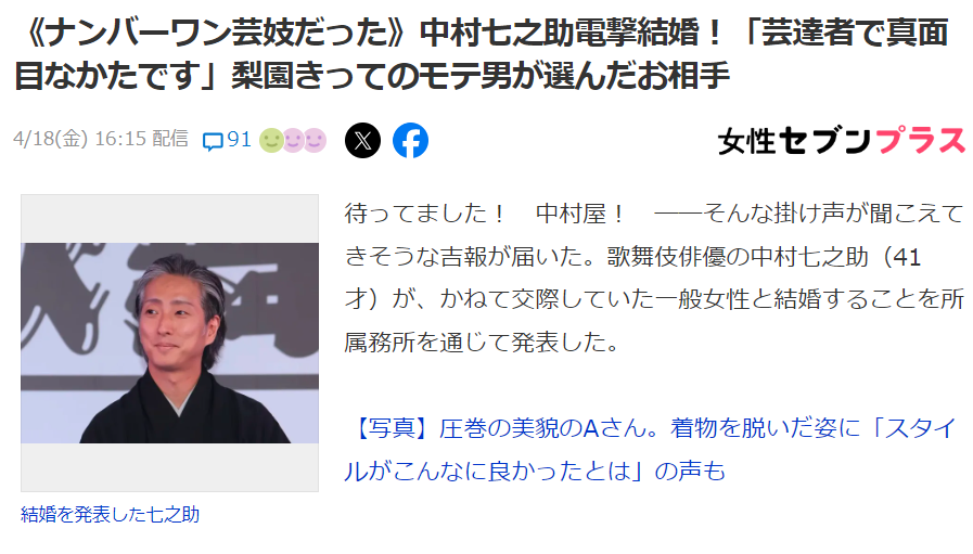 4月18日,現年41歲的日本歌舞伎演員中村七之助官宣了結婚的消息。