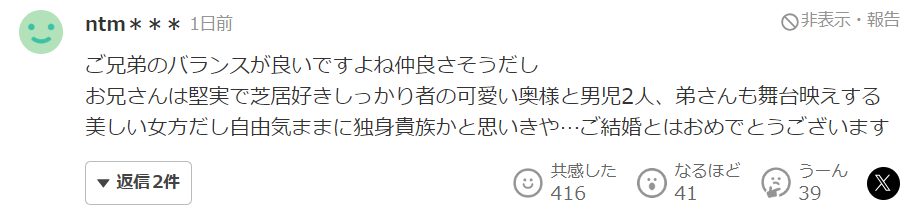 哥哥穩重、演技又好,還有一個可愛的太太和兩個男孩;弟弟也是舞台上的美女,還以為他要一輩子都是自由任性的單身貴族呢……恭喜您結婚”
