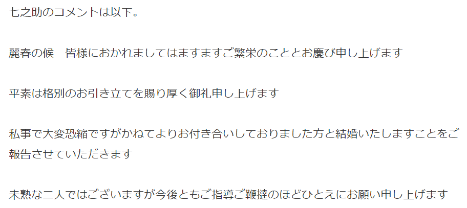 中村七之助向媒體發送的結婚宣告是這樣寫的:
