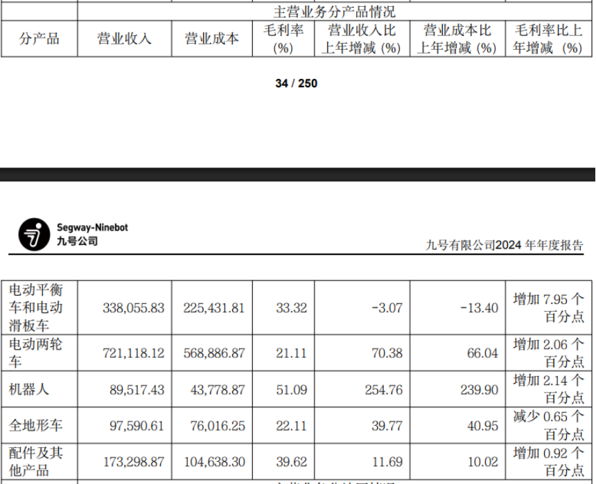 比如九號的機器人業務,雖然收入佔比不高,但毛利率遠超其他業務板塊,其機器人業務去年的收入增速達到了254.76%,帶動公司毛利率同比增長2.26個百分點至30.48%。