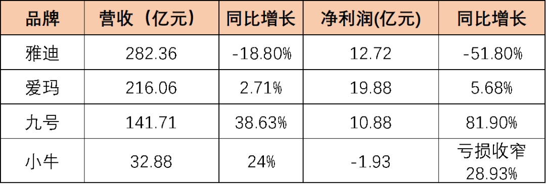 當“蛋糕”無法做大的時候,誰多分了一塊,就必然有人少分了一塊。以九號為例,其去年電動兩輪車銷量為259.89萬台,同比增長76.61%,相較之下,雅迪去年則少賣了約350萬輛車。