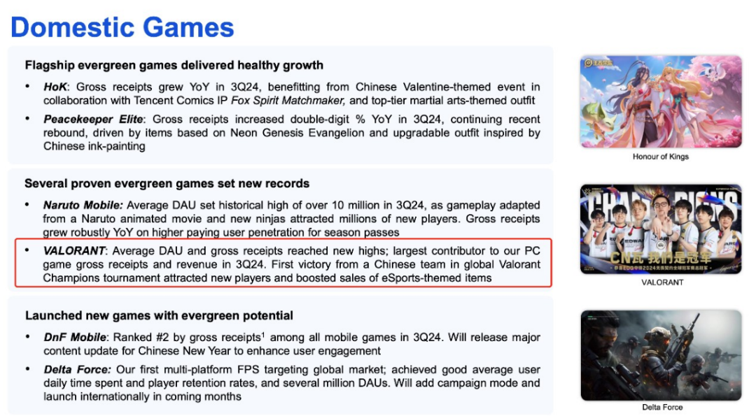 作為一款深度競技遊戲,《無畏契約》國服僅用一年時間同時在線人數就突破了百萬,也是騰訊2024年Q3財報的重點表揚對象——既是騰訊遊戲旗下PC收入的最大貢獻者,某種意義上來説,也已經是國內PC收入第一的FPS產品。