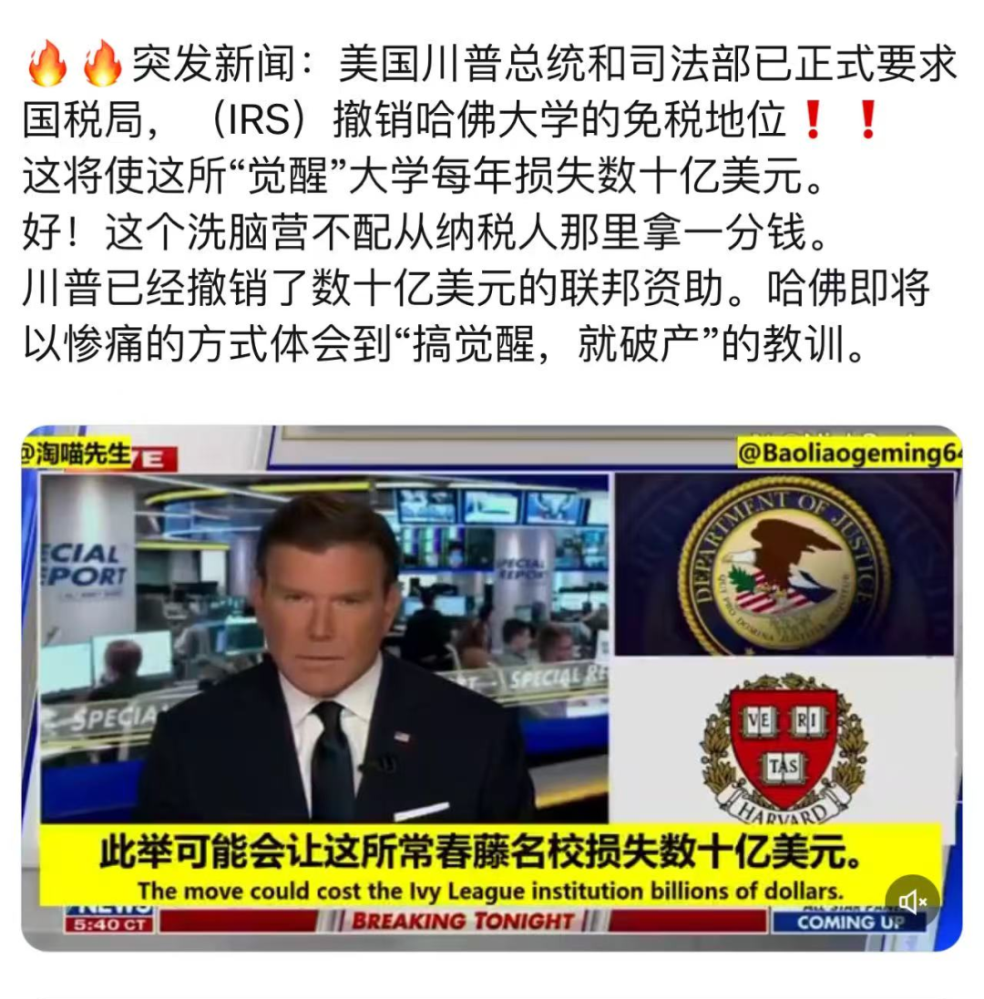 突發,特朗普要撤銷哈佛大學的免税地位: