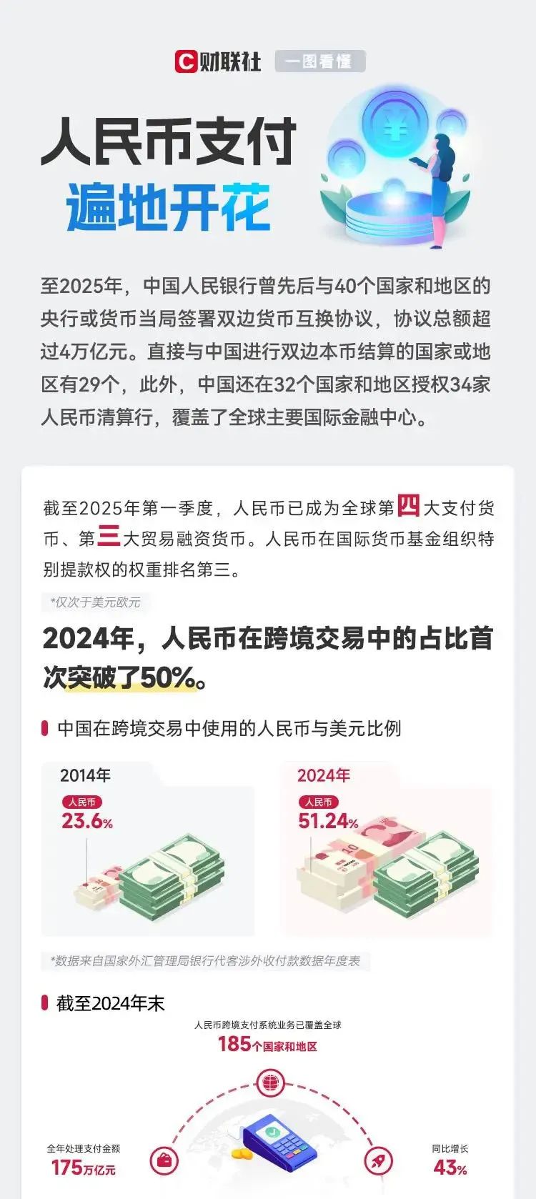 2024年,中國在跨境交易中使用人民幣的比例已經超過美元,達到51.24%。2025年一季度,人民幣已經成為全球第四大支付貨幣、第三大貿易融資貨幣。