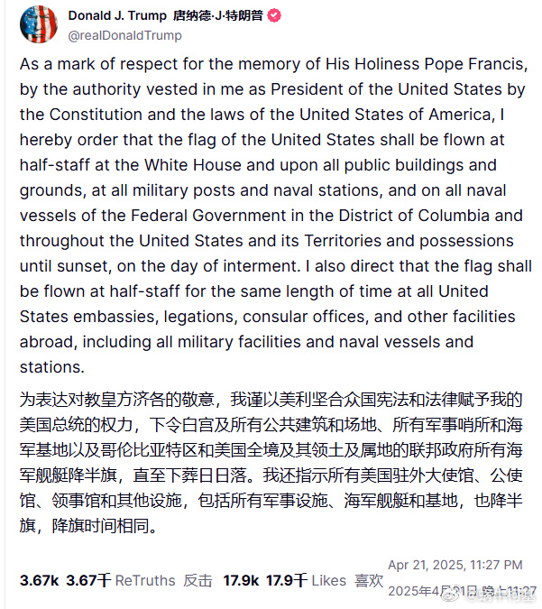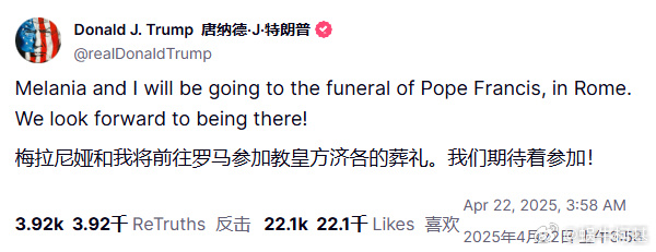 特朗普宣佈全美為教皇的去世降半旗,同時他和梅拉尼婭將參加方濟各的葬禮。