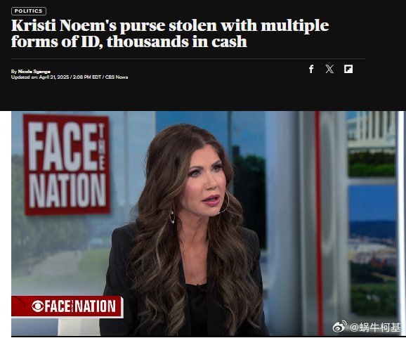 美國國土安全部長克里斯蒂·諾姆的錢包週日在華盛頓一家餐館被盜,裏面有她的駕照、護照、國土安全部徽章、支票、信用卡、化妝品、藥品和約 3,000 美元現金。