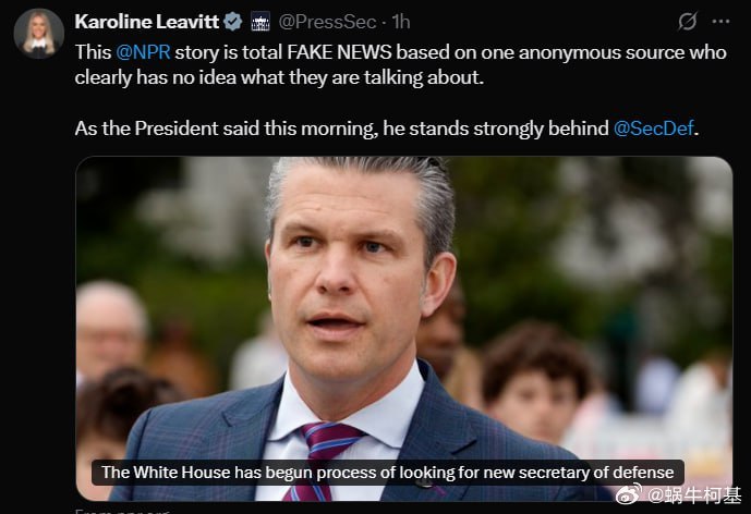 白宮新聞秘書萊維特還發文否認了關於美國政府正在尋找候選人接替防長赫格塞斯的報道。