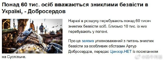 ‼️🇺🇦🏳️烏克蘭失蹤人員事務專員多布羅謝爾多夫表示:“目前有超過6萬失蹤人員正在被通緝,已確認其中超過1萬名被關押在俄羅斯境內。”