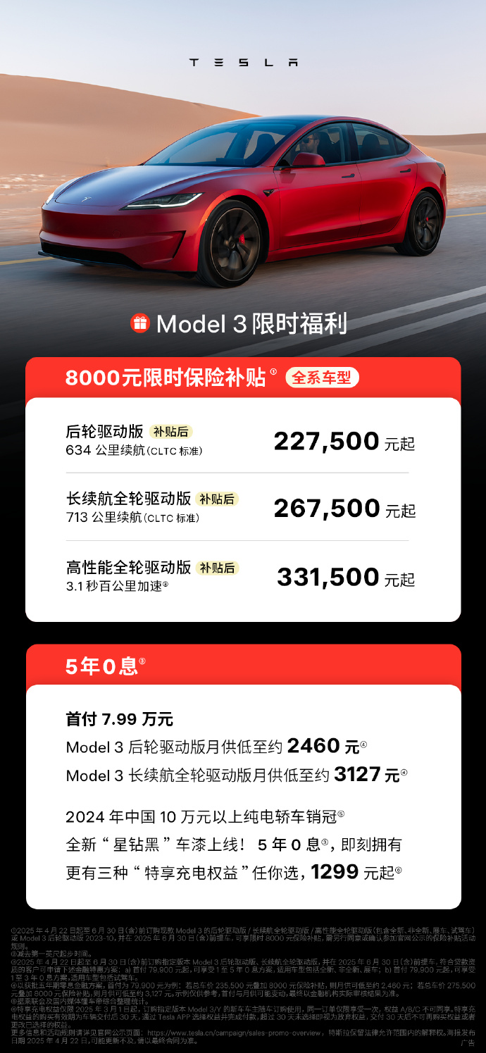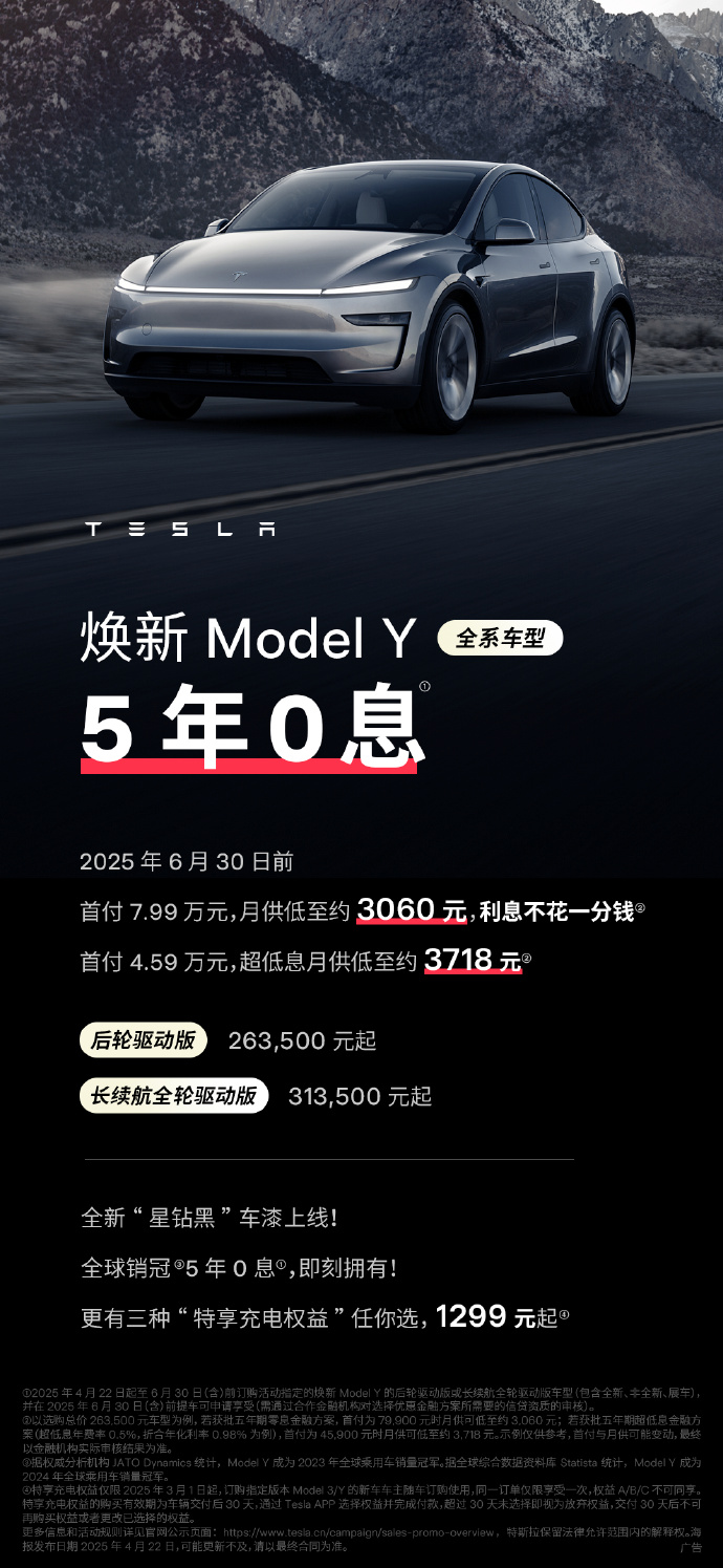 特斯拉中國官方發佈消息:6月30日前,煥新Model Y首次全系推出5年0息,首付7.99萬元,月供低至約3060元;6月30日前,Model 3全系推出限時8000元保險補貼,後驅/長續航版疊加5年0息,月供低至約2460元。